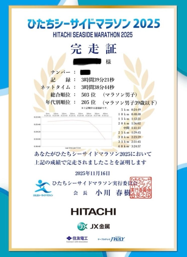 日曜 🏃♂️日立シーサイドマラソン:3時間38分