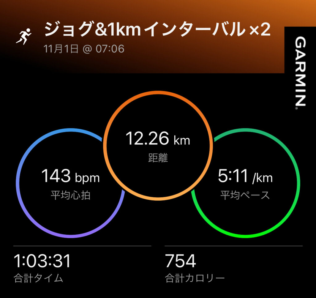 大会2週間前ということで無理せずに、1kインターバル2本に留めて実施💡