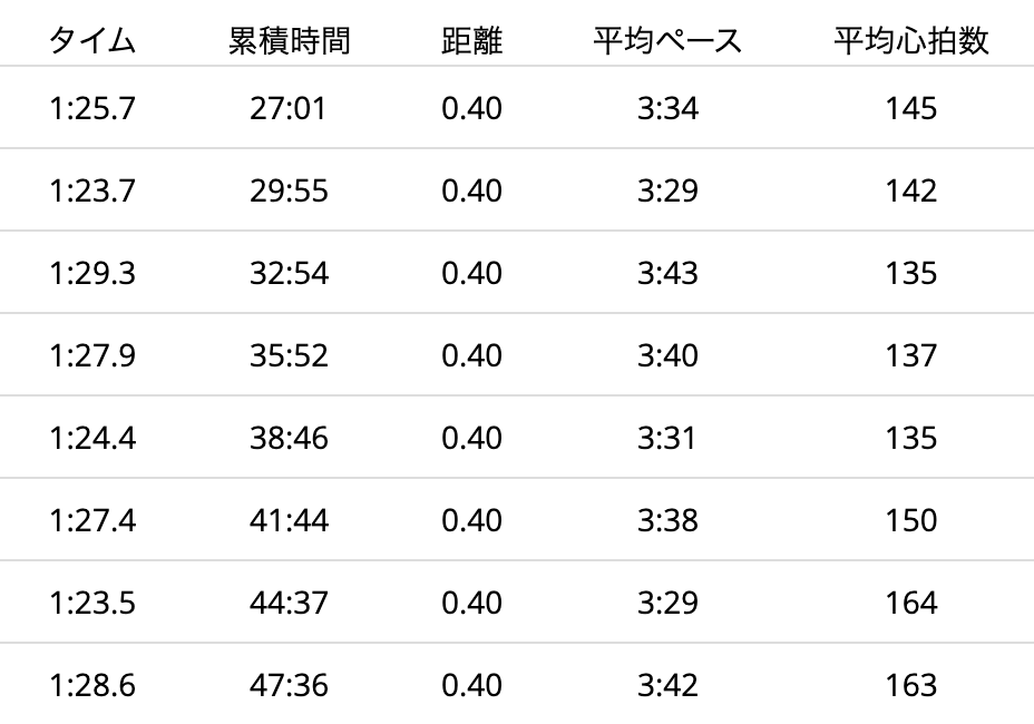 現時点の400mインターバルの適正タイムは、VDOT45によると94秒(1:36)。